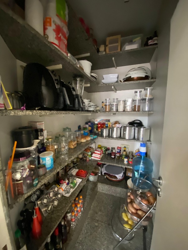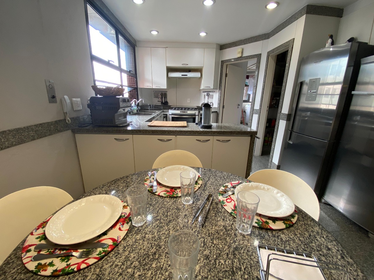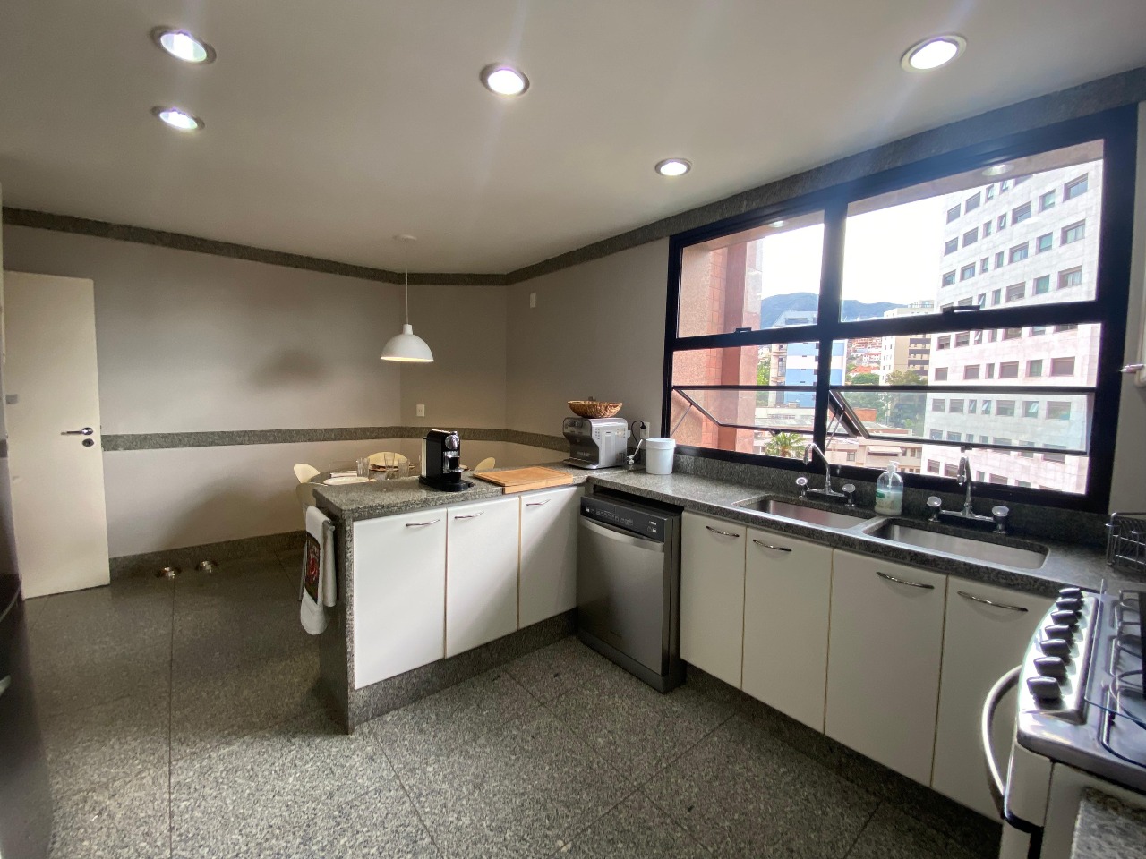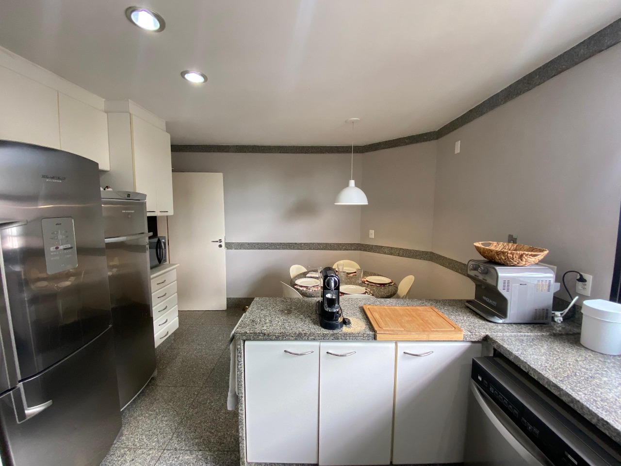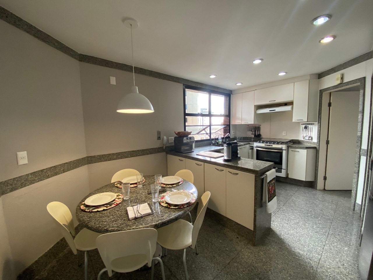 . Cozinha com piso e bancada em granito com armários;