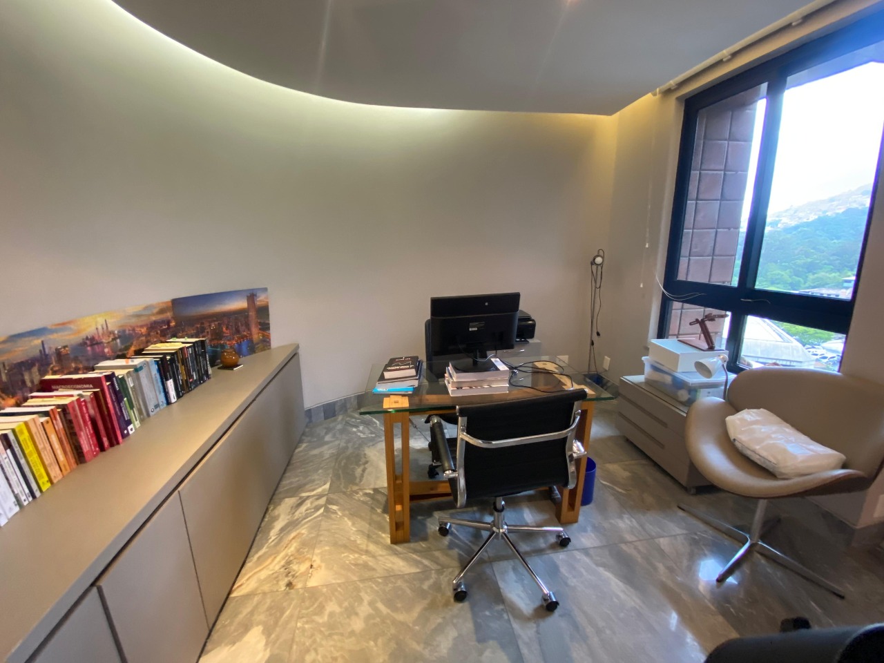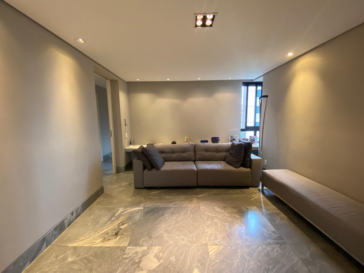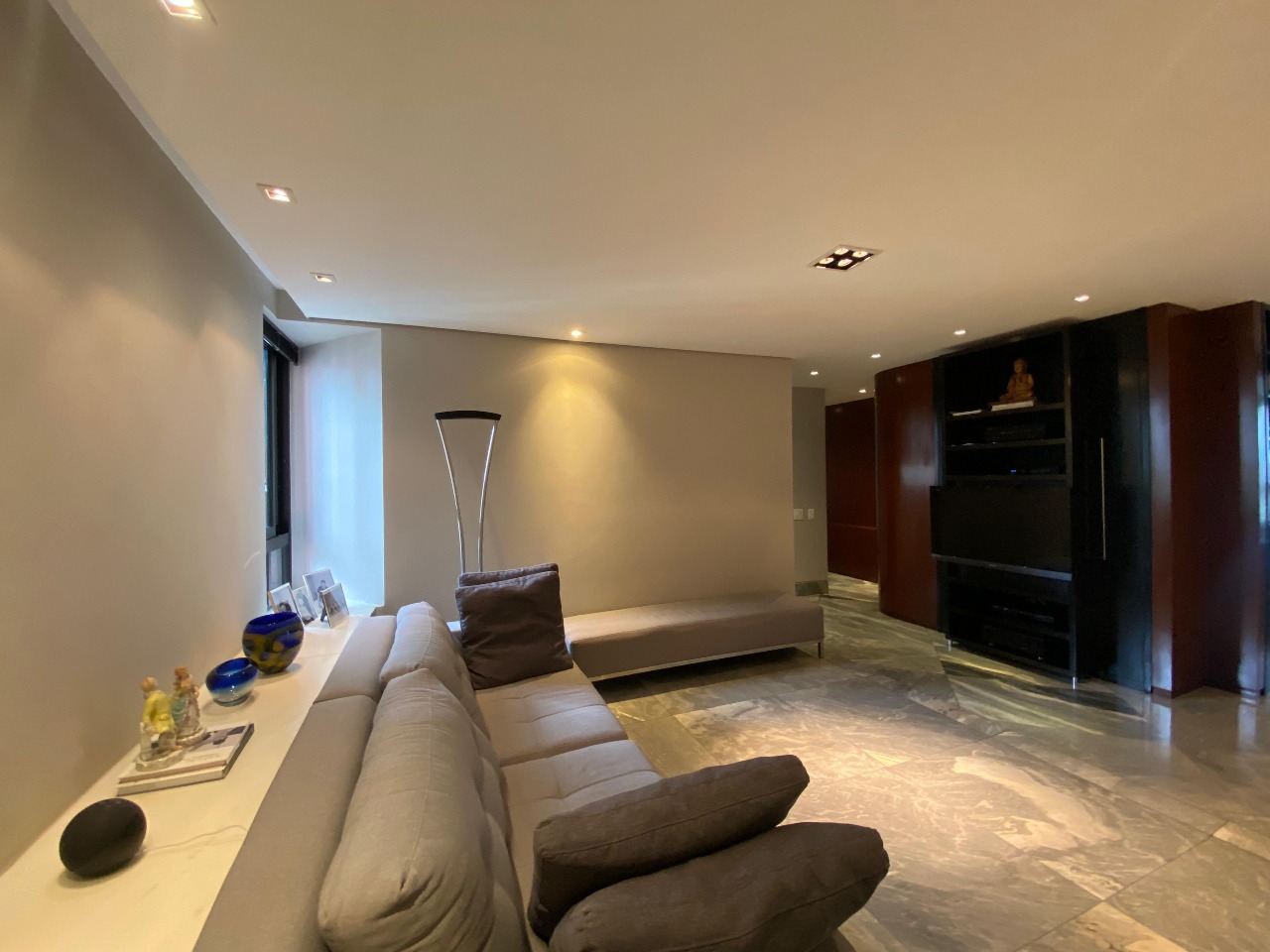 . Estar íntimo com piso em mármore, rebaixamento de teto em gesso e projeto de iluminação;