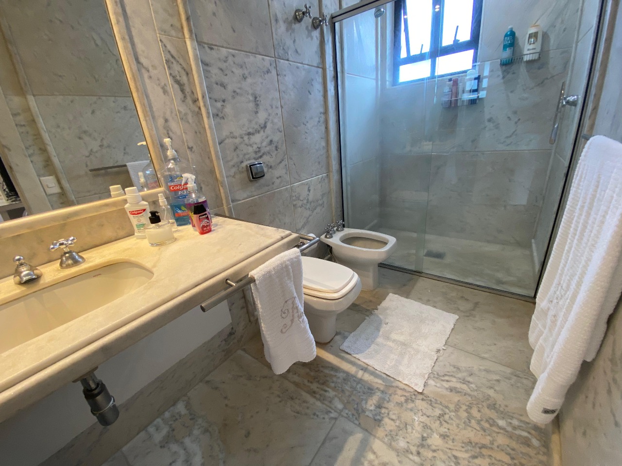 . 1 banho social com piso e bancada em mármore;