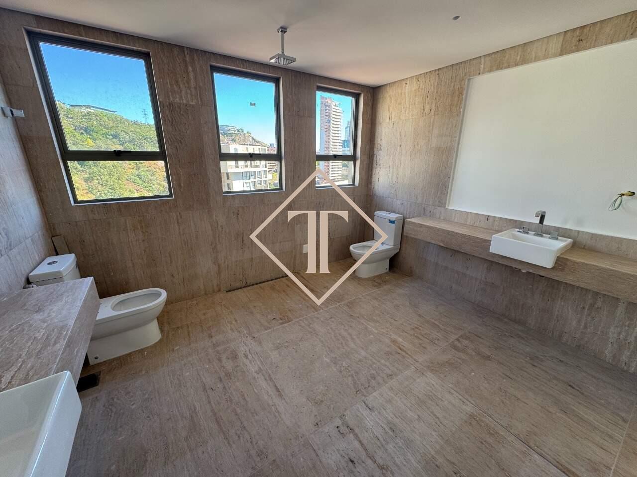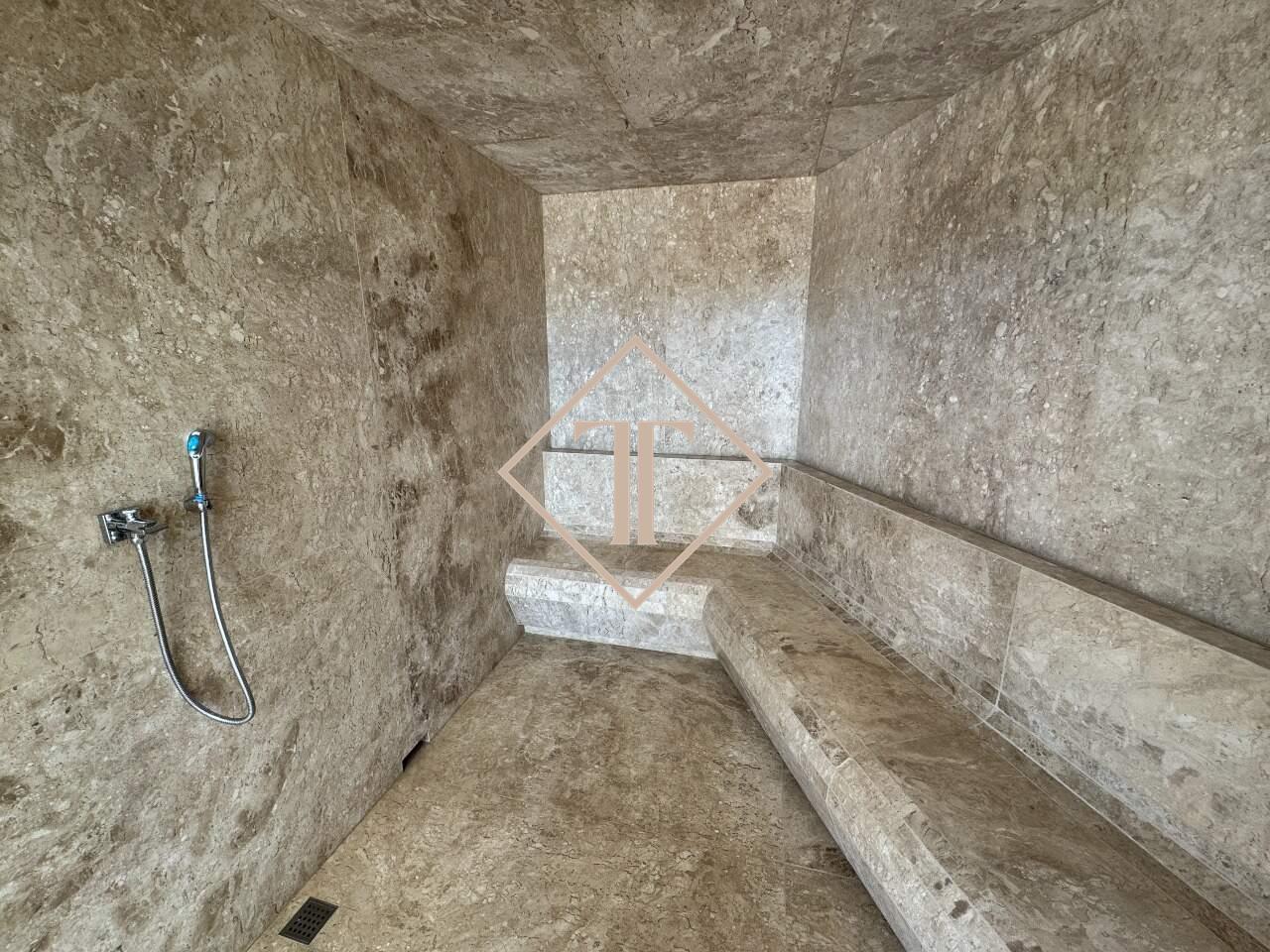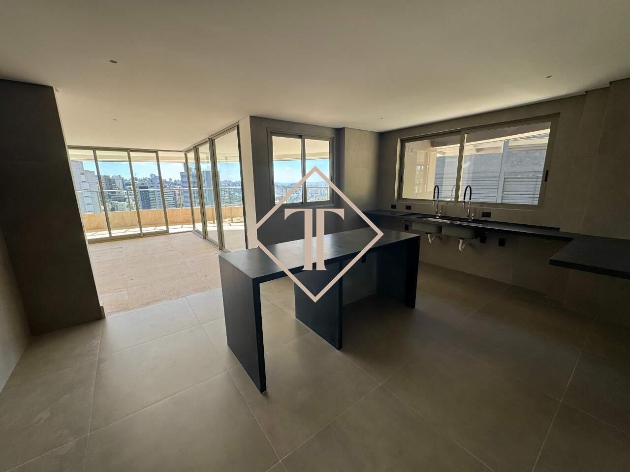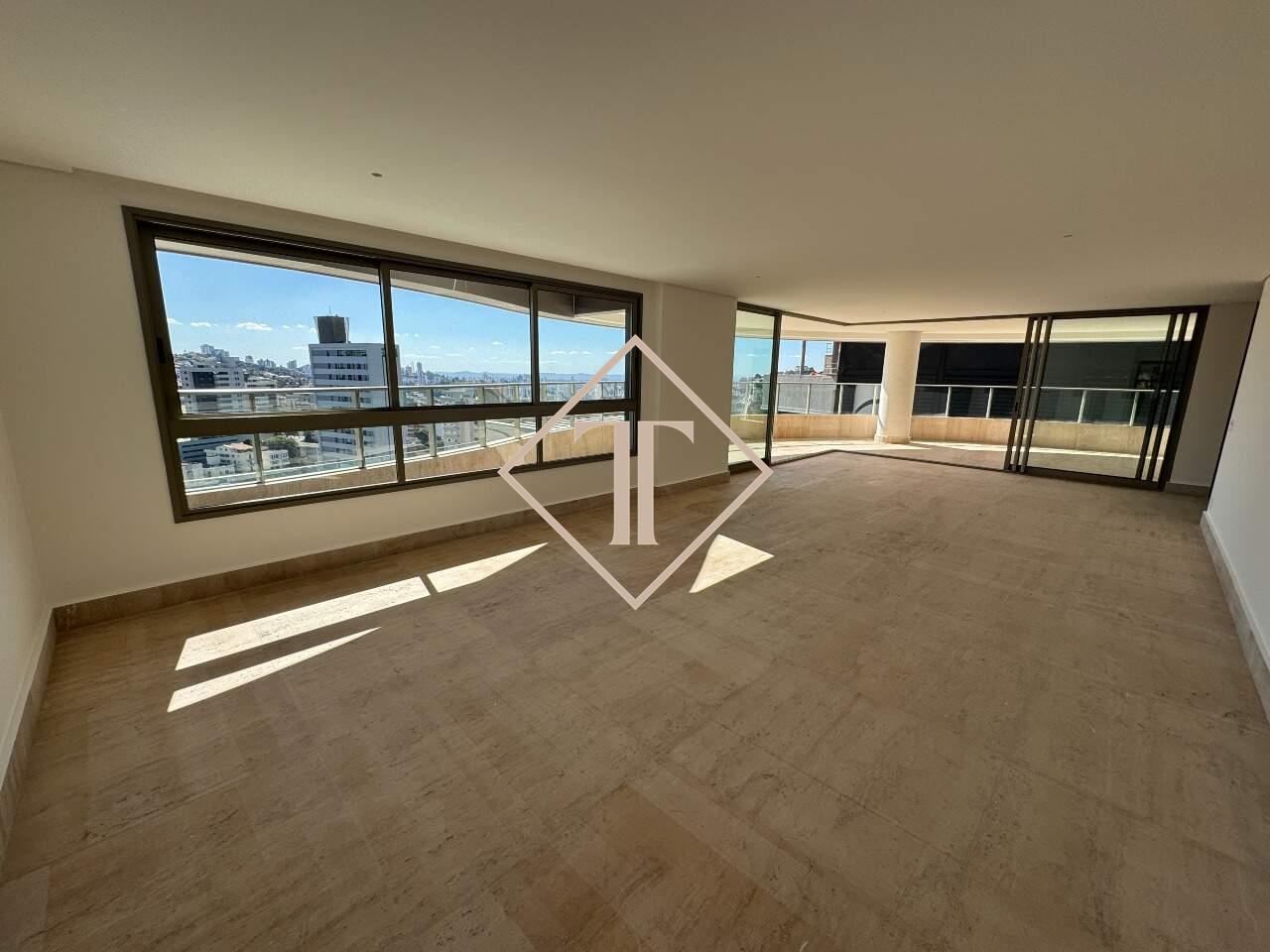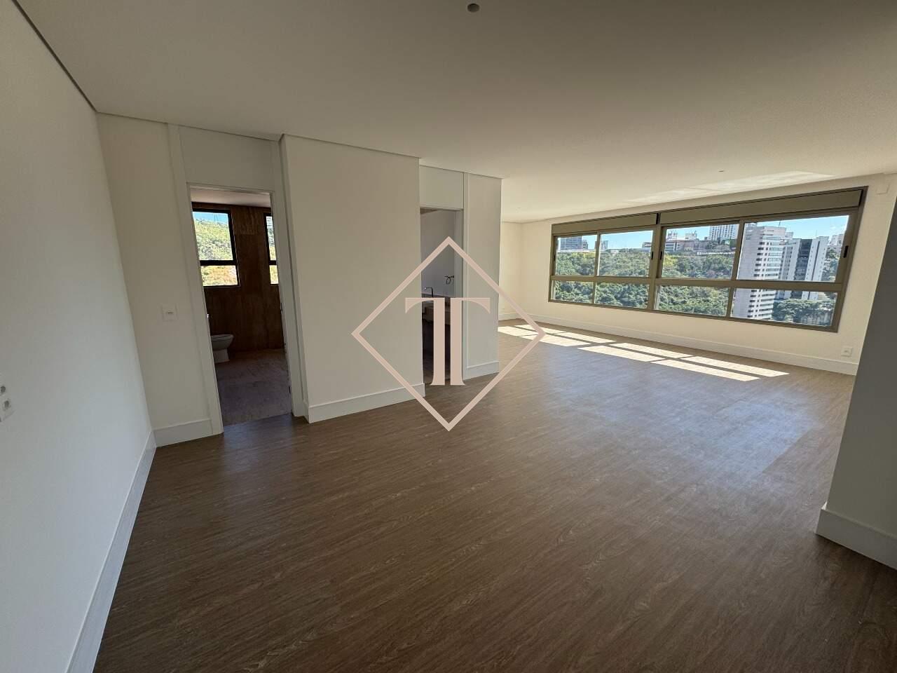 Apartamento com 4 suítes e 323,73 m². Sala para vários ambientes com piso em travertino, integrada à varanda ampla e à cozinha planejada. Nos quartos, piso vinílico que proporciona conforto e aconchego, e nos banheiros porcelanato que reproduz o travertino, unindo praticidade e sofisticação.